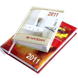 Okładkę drukujemy na papierze kredowym 200g/m2. Następnie jest foliowana, wykrawana i oklejana. Pomiędzy tekturą a zadrukowaną przednią okładką umieszczana jest gąbka introligatorska, dzięki czemu uzyskujemy efekt wypukłości. Nadaje to kalendarzowi ekskluzywnego wyglądu i sprawia, że jest miły w dotyku.